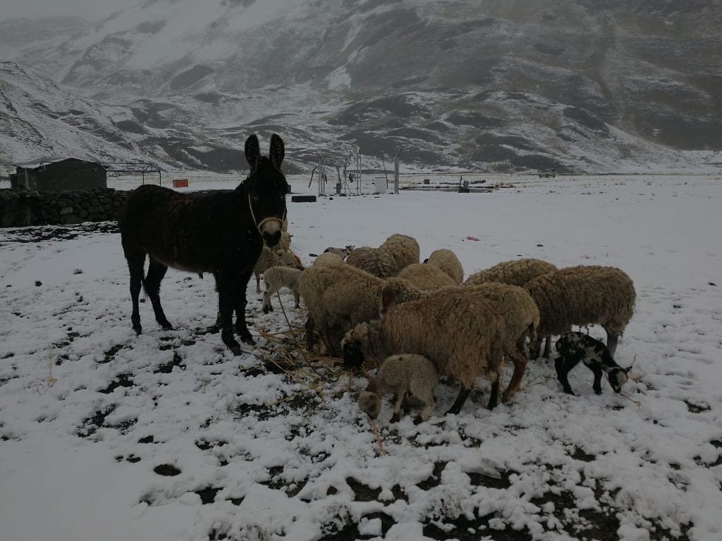 “Lasciamo la missione di Peñas in pulmino-taxi e dopo alcuni km di strada asfaltata prendiamo un lungo sterrato che risale dolcemente la lunghissima valle piena di alpaca e lama. La valle si chiude e incontriamo i nostri arrieros, i portatori del nostro materiale con i muli. Qui le condizioni di vita sono toste, ma sembra che il freddo e la neve non infastidisca chi ci abita. I bimbi giocano fuori, le donne camminano sulla neve con scarpe basse da città con le dita scoperte e senza calze. Incredibile la loro sopportazione al freddo! Scarichiamo le sacche e il cibo e partiamo con i nostri zaini a piedi sotto una leggera nevicata. Dopo un’ora arriviamo al lago Chiar Khota, l’ambiente con lago, neve e nubi basse sembra islandese. Ci sistemiamo nel rifugio che non è altro che una stanza con i materassi a terra e un altro ambiente ad uso cucina. Molto meglio essere qui piuttosto che in tenda con vento e neve.