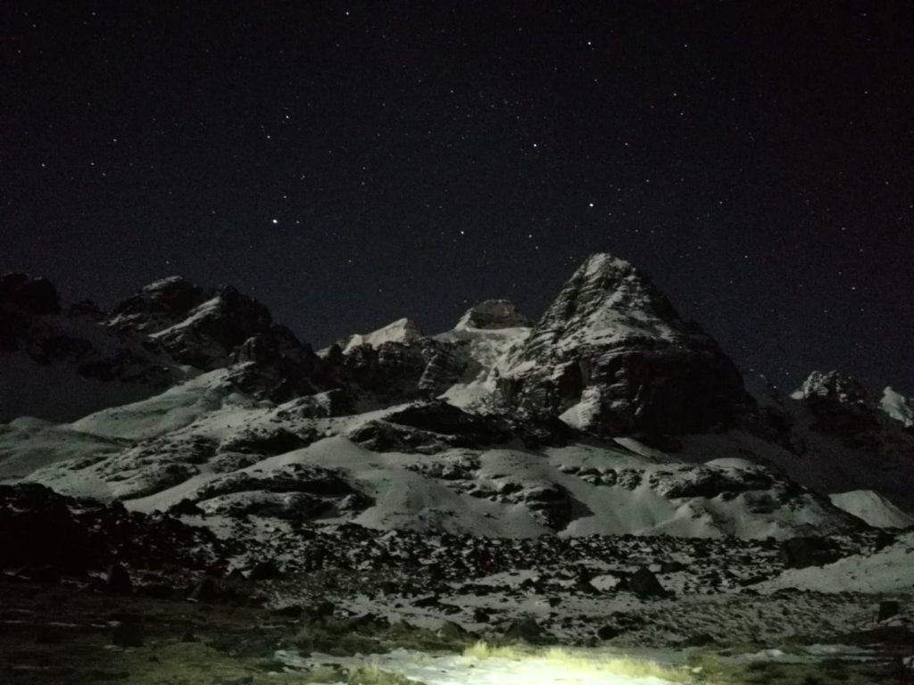La mattina successiva ci alziamo all’una di notte per riuscire a partire alle 2:15. Un’ora prima rispetto a ieri consapevoli della lenta progressione a causa della neve alta. Dopo le ultime nevicate non è salito nessuno sul Condoriri e la traccia è tutta da fare. Ieri mi sono riposato, sto un po’ meglio e mi è tornato l’appetito. L’avvicinamento è altrettanto lungo ma al contrario di ieri si inizia a guadagnare quota abbastanza velocemente. Miguel ha già salito il Condoriri ma così tanta neve non l’aveva mai trovata. La prima parte è solitamente su sentiero roccioso ma la neve e il buio ci fanno sbagliare il percorso almeno 3 volte. Raggiungiamo il canale giusto che affianca la lunga lingua di ghiacciaio crepacciato e la pendenza inizia a essere problematica. Il fondo è sassoso, instabile e ghiacciato, coperto da 40 cm di neve fresca, solitamente mai presente in questo periodo. Più volte ci fermiamo per riposarci, senza dire nulla, consapevoli che non sarà possibile raggiungere la cima del Condoriri a causa della troppa neve presente. Con tanta fatica raggiungiamo la sella al di sotto del Campo Morena. Dal canale opposto, molto ripido ritroviamo Thomas, un ragazzo argentino che è partito insieme a noi ma che poi ha scelto un altro percorso. La neve gli arriva in vita e si fa spazio sulla neve con le due piccozze ad ogni passo. Incosciente trovarsi in quel canale da solo.