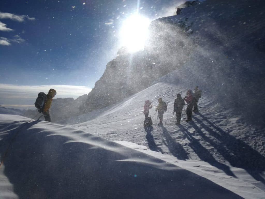 Mi sono dato questo limite per decidere se tornare o continuare e decido poi di provarci. Indossiamo ramponi, imbrago e piccozza, ci leghiamo in cordata: io con il peruviano Miguel e Davide con la messicana Francesca. Iniziamo a salire e capisco subito che sarà durissima per l’inconsueto accumulo di neve. Abbiamo avanti a noi 2 cordate di argentini con mezz’ora di vantaggio e altre due cordate con guide Boliviane. In breve li raggiungiamo e Miguel passa davanti per dare il cambio nel fare la traccia.