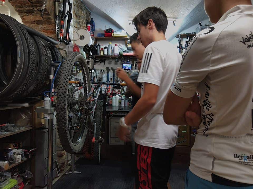 Fabio Matiz a tal proposito, con i suoi giovani atleti della ASD Calice Bike, per l’insegnamento della manutenzione della MTB si rivolge a un professionista del settore: Luca Bondi di Riviera Outdoor Bike Shop, negozio e officina specializzata situata nel cuore di Finalborgo a Finale Ligure. La bottega, come Luca è solito chiamarla, è diventata un luogo di condivisione e apprendimento delle nozioni base e avanzate utili alla pratica dell mountain bike da parte dei più giovani.