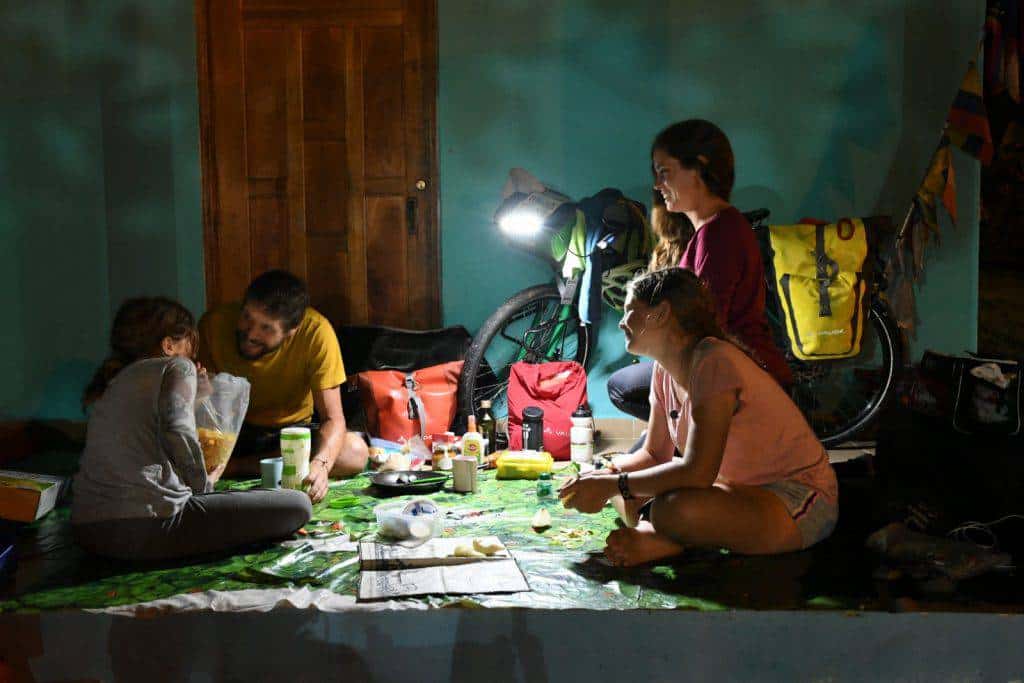 Negli ultimi 2 anni abbiamo soggiornato in totale in una decina di alloggi semplici, per il resto in tenda (fino a Quito in Ecuador, usavamo 2 tende ma poi quando le zone si sono fatte più popolate e per ridurre peso, abbiamo cambiato a una tenda da 4). Ma ci devono essere le condizioni di sicurezza che lo permettono. In alternativa veniamo ospitati in casa da splendide famiglie (sistemandoci spesso anche sul pavimento con i nostri materassini e sacchi a pelo) che ci accolgono spontaneamente, curiosi di conoscerci.