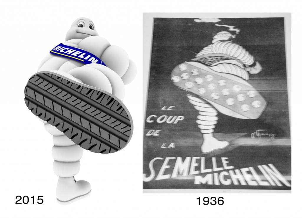 Del resto l’interesse di Michelin per le suole delle calzature, in particolare da lavoro, risale agli anni ’30 del secolo scorso. L’ho personalmente scoperto un anno fa’, trovandomi a Clermont Ferrand (sede del Gruppo) per compiere escursioni sul mitico Puy de Dome. Pernottando in una locanda tipica della cittadina, uno di quei posti “francesi” dove ti aspetti di vedere Maigret seduto al bar, per intenderci, ho notato una locandina consumata appesa ad una parete dietro la reception. Il soggetto era il famoso “omino Michelin” (in arte Bibendum) nell’atto di sollevare una scarpa e mostrare orgogliosamente la suola scolpita. Lo slogan decisamente chiaro: Le coup de la semelle Michelin (il colpo della suola Michelin). La stessa posa, oggi, è stata utilizzata per il lancio “moderno” del progetto Technical Soles, con la sola differenza che Bibendum non ha più il sigaro fumante in bocca.