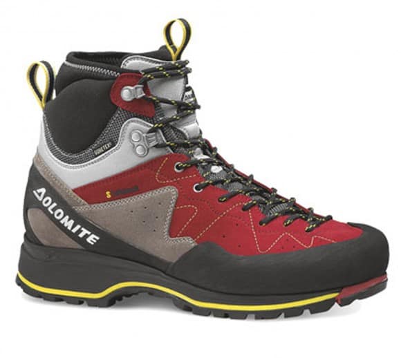 Lo scarponcino Dolomite Steinbock Approach HP GTX ha un bell'aspetto, prevalentemente scuro ma luminoso nei dettagli argentati e laccetti gialli. Il modello testato è un 42 nero ma esiste anche la versione su base rossa. Il peso è contenuto e la suola non è troppo rigida, nonostante la buona struttura faccia supporre il contrario: flettendola manualmente la punta arriva facilmente a toccare il collo del piede. Suola Vibram con tacco e punta leggermente arrotondate per facilitare il passo; la mescola in punta è diversificata e separata dal resto della suola. L'intersuola è gommosa e irrigidita da uno strato rigido giallo. Il perimetro è interamente protetto da una spalmatura gommata non troppo rigida. La punta e i fianchi sono abbastanza morbidi, il tallone più rigido, soprattutto all'esterno. Il resto della calzatura è in pelle scamosciata, tessuto e neoprene a due densità differenti per avvolgere meglio il collo del piede. Ottima la calzata e la sensazione di avvolgenza e comodità è immediata. L'allacciatura è classica, passa attraverso 7 fori e 2 ganci, il primo dei quali con la strozzatura e l'ultimo orientato a 45 gradi verso il basso per una migliore tenuta del laccetto in fase di piegamento. La linguetta è comoda e ben costruita, e la calzata è facilitata dalle due asole in tessuto. La soletta è classica e rialzata sul tallone, mentre il plantare è sagomato e integrato all'interno della calzatura la quale è interamente foderata dalla membrana in Gore-Tex, anche nella parte inferiore.