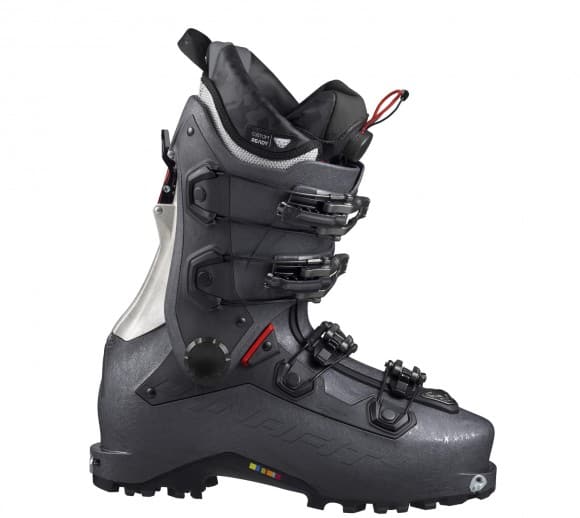Khiôn MS è uno scarpone da freetouring di nuova generazione, creato in collaborazione con gli atleti DYNAFIT. Gli obiettivi prefis- sati erano una performance senza pari e precisione, con trasmissione diretta dell‘energia e la massima tenuta. Il nuovo Precision Lock System li ha raggiunti. Questo sistema brevettato consente di fondere le diverse parti dello scarpone in un unico pezzo resistente alla torsione, raggiungendo la massima rigidezza anche sotto un elevato sforzo meccanico. La rigidezza dello spoiler di magnesio risparmia peso e consente al Precision Lock System di sprigionare tutta la sua energia. La stabilità laterale e la rigidezza nell‘inclinazione vengono raggiunte tramite l‘“esoscheletro“ nello scafo esterno. Gli ammortizzatori laterali e la struttura asimmetrica sostengono le gambe in curva, per una trasmissione diretta dell‘energia.