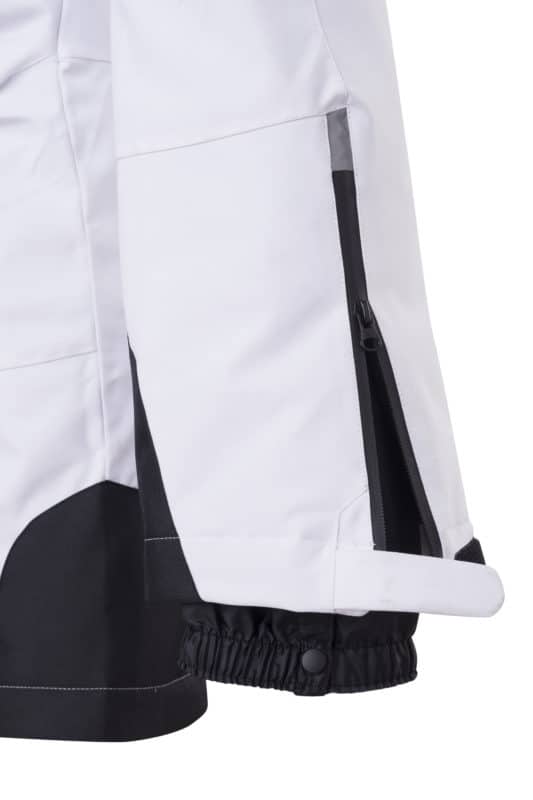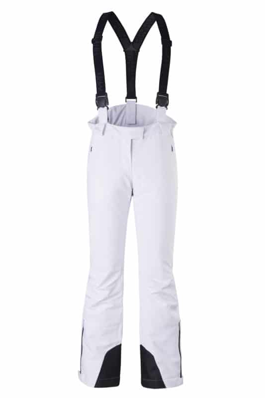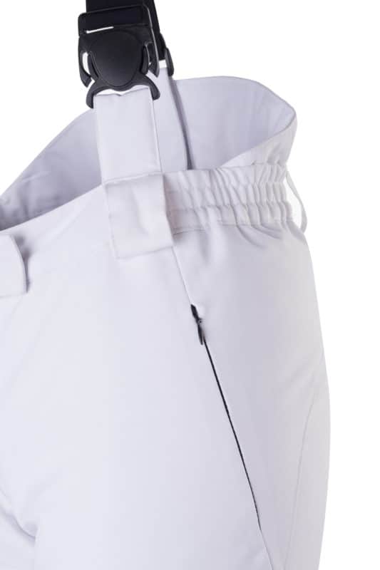 elastico in vita, gancio interno vita, ginocchia ergonomiche, ghetta interna paraneve su fondo gamba, protezioni su fondo gamba
