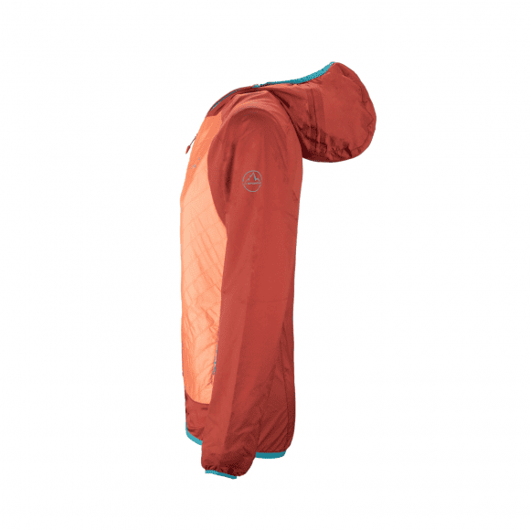 La giacca ibrida Task di La Sportiva è un modello molto leggero dai colori vivaci e ben associati che danno vita ad un capo moderno piacevole da indossare. Il taglio è regolare, non troppo aderente per permettere di abbinarlo ad un base layer, oppure ad uno strato superiore più caldo. Il capo è ibrido: nella sua costruzione associa diversi tipi di materiali in base al body mapping, ritroviamo il PrimaLoft nella parte frontale della giacca, cappuccio, maniche e schiena sono in un tessuto molto leggero e traspirante. Troviamo due tasche laterali ampie e comode chiuse da zip. Indossato il modello è subito comodo: notiamo che l'abbinamento dei materiali è studiato per migliorare il comfort in prestazione. Le maniche sono lunghe e strette da piccoli polsini elastici, che ritroviamo anche in vita per fermare l'aria. La cerniera frontale è completa ed alta fino a raggiungere il naso, il cappuccio è ampio e avvolgente, tanto che non ha bisogno di coulisse, nalla parte della nuca è stato lasciato un buco dal quale possiamo fare uscire la coda di capelli. Il capo è molto leggero e se proviamo ad appallottolarlo occupa poco più di una "mela" di spazio.