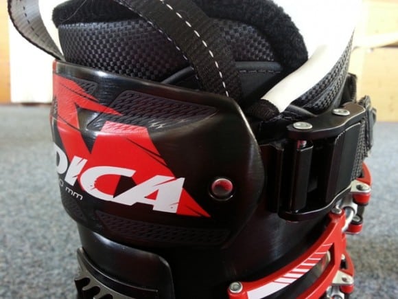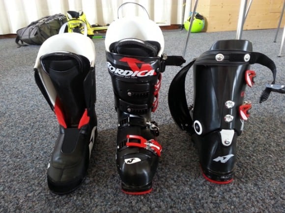 Lo scarpone Nordica GPX 130 è un parente strettissimo del Dobermann GP 130. A prima vista qualche dettaglio lo fa apparire diverso ma se si affiancano la forte somiglianza è evidente. Stesso nuovo scafo, grande cambiamento in casa Nordica che ha deciso di ammodernare lo storico modello Dobermann. E' un bello scarpone aggressivo, nero satinato abbinato a dettagli bianchi e rossi. La grande novità è il "Full Motion Pivot", classica regolazione canting con boccole metalliche con l'aggiunta di un secondo setting importante: il gambaletto può essere ruotato verso l'esterno fino a 2 mm. per assecondare la naturale direzione in flessione della gamba. Anche lo strap superiore viene proposto over size, arrotondato soprattutto nella parte alta per una migliore tenuta in flessione. Il gancio di chiusura dello strap è innovativo e rapido da tensionare, per aprirlo non si deve mai sganciare la cinghia ma solo allentarla. Scarpetta senza lacci in "Cork Fit" (sughero e resina) termoformabile per infinite volte, e imbottitura in Primaloft, leader in termicità abbinata a traspirabilità. Due grandi asole facilitano la calzata e l'ottimale posizionamento della scarpetta e del linguettone. Sulla parte posteriore è posizionabile lo spoiler a velcro per regolare leggermente l'inclinazione in avanti e per dare un maggior supporto al polpaccio. La soletta è soffice e imbottita, appena sagomata sul tallone. I 4 ganci servolock hanno la regolazione micrometrica e sono leggermente rialzati per favorire l'inserimento delle dita in fase di sganciamento. Avendo già testato il cugino Dobermann GP 130 sono curioso di valutarne le differenze. (Riccardo Stacchini)