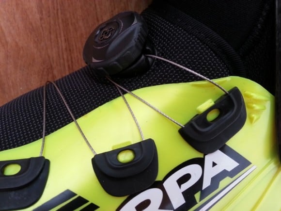 Gli scarponi Scarpa Alien 1.0 sono bellissimi! La linea è accattivante e minimalista, si fatica a pensare che abbia una sufficente tenuta in discesa. Ultraleggeri con la scarpetta a vista sul collo del piede e gambaletto in carbonio a sezione crescente dall'alto verso il basso. Lo scafo è in plastica rinforzato in carbonio internamente nei 2 lati. Sia lo scafo che il gambaletto presentano alcune nervature in rilievo per rinforzare la struttura nei punti maggiormente sollecitati. La suola è in Vibram, veramente ridotta al minimo. La parte superiore del piede è tensionata da un sottilissimo cavo in acciaio regolabile tramite sistema "Boa", rotella che avvolge e tende il cavo, e se tirata verso l'alto sgancia la tensione. Un unico cordino funge da chiusura del gambaletto: passa attraverso 4 asole metalliche (le stesse delle scarpe da trekking) con i due capi fissati con semplici cappi. La tensione viene semplicemente regolata allentando e riannodando il cappio (si dovrà provare qualche volta prima di trovare la posizione ideale per tenerla poi fissata senza più sciogliere il nodo). La leva posteriore tende il cordino quando abbassata e si aggancia su un perno trasversale bloccando l'escursione del gambaletto per la discesa. Per camminare e affrontare la salita con le pelli si alza semplicemente la leva. La scarpetta è totalmente chiusa, senza regolazioni, e assomiglia ad un calzare da sub. Due asole poste anteriormente e posteriormente facilitano la calzata. Presenta dei rinforzi nei punti più sollecitati, soprattutto sul gambaletto anteriore. Per calzare lo scarpone non è necessario estrarre la scarpetta, per toglierlo invece si, ma il tutto è estremamente facile e veloce. Comodissimo appena calzato, sembra una pantofola! L'escursione del gambaletto da aperto è eccezionale, la tibia flette in avanti e indietro senza intralci e tutto il sistema sembra estremamente semplice ed efficace. Una volta chiusi "Boa" e leva posteriore la tenuta sembra ottima. Sono estremamente curioso di provarlo in discesa per confrontare le sensazioni a secco. Peso 700 grammi!(Riccardo Stacchini)