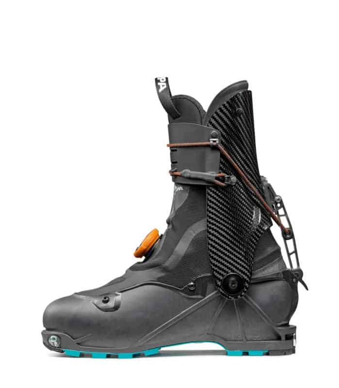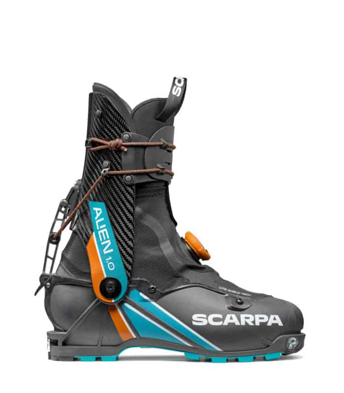 La chiusura superiore dell' Alien 1.0 carbon di SCARPA è formata da due alette fissate al gambetto, dotate di alloggiamenti dove viene posizionato un cordino in kevlar che, tramite un asola, può essere chiusa ad una distanza a piacimento dell'utilizzatore. Questo permette di aprire o chiudere l'escursione del gambetto.