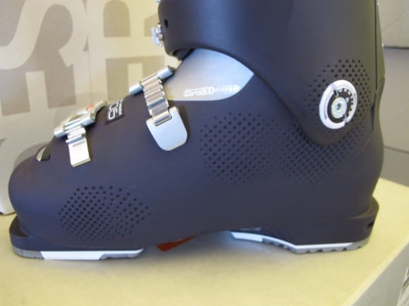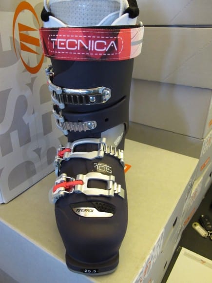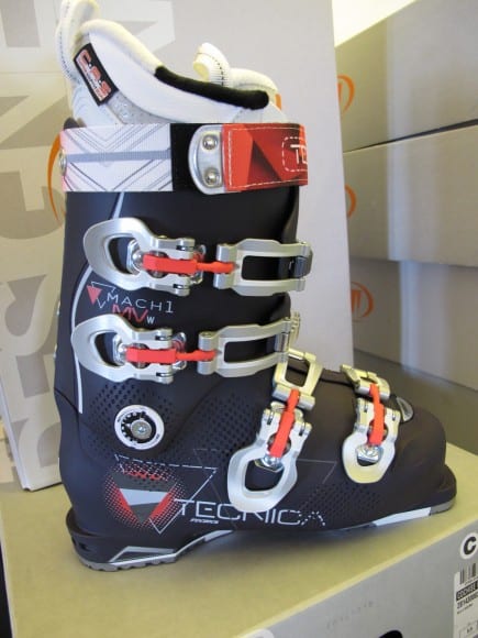 Tecnica Mach 1 MV 105 W, design accattivante e particolare nel suo genere. E' uno scarpone da all mountain presentato in due larghezze di pianta: LV 98mm(Low Volume) ed MV 105mm(Mid Volume), possiamo sceglierlo in base alla conformazione del nostro piede ed al nostro stile di sciata. La scarpetta è termoformabile con il sistema CAS, che permette di termoformare anche con il phon. Uno scarpone a quattro ganci regolabili micromillimetricamente, con un gancio superiore che ha la possibilità di essere regolato senza spostare viti, ma con un sistema di molle, ed una fascia superiore con easy strep. Lo scafo esternamente è opaco con delle porosità create apposta per facilitare il lavoro dei boot fitter ed esteticamente piacevoli. Mach1 è dotato di sistema quik in step, per facilitare il fitting dello scarpone, una combinazione di due plastiche, una morbida più vicina al piede per facilitarne la calzata. Noi li abbiamo provati LV con flex 105, appena indossati la sensazione è comoda, la pianta piatta e l'inclinazione del gambetto non estremamente accentuata. Il piede si trova comodo. La suola è in gomma ed intercambiabile contattando il customer service.