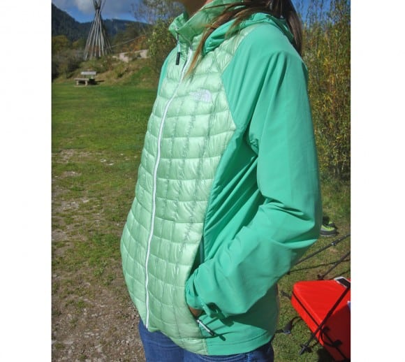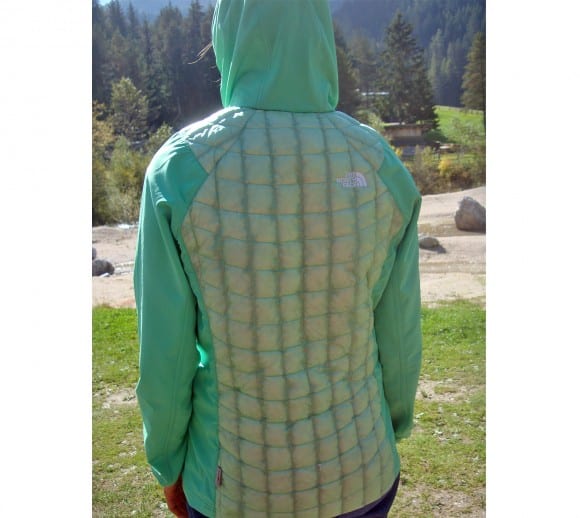 La giacca Thermobal Hybrid di The North Face è un capo molto tecnico con il busto in Thermoball che risulta molto caldo e maniche e cappuccio in un tessuto traspirante e leggero a suggerire maggiore libertà di movimento. In questo capo troviamo la soluzione per chi necessita di un indumento che sia una via di mezzo tra un gilet ed una giacca leggera, per questa sua destinazione non completamente definita si chiama Hybrid. La giacca è aperta davanti e dotata di due ampie tasche laterali chiuse da zip. Il collo ancora in Thermoball sale alto e su questo si inserisce il cappuccio dello stesso materiale delle maniche. Il taglio è femminile, sciancrato sui fianchi. Indossata risulta da subito comoda e permette una buona libertà di movimento, si nota come la parte del busto sia subito calda, la sensazione a pelle è buona ed il materiale da calore. Le maniche in nylon hanno una fuzione protettiva da aria ed in lieve quantità anche da acqua. Un capo comodo che può trovare svariati campi di utilizzo. (Letizia Ortalli)