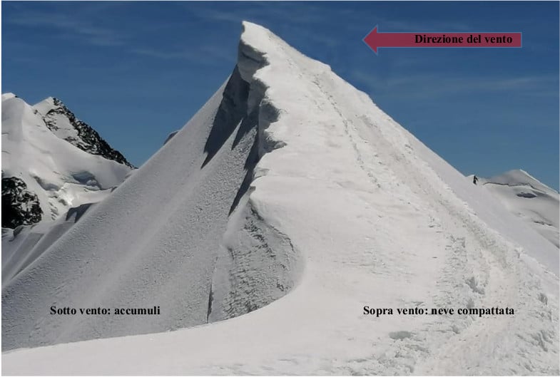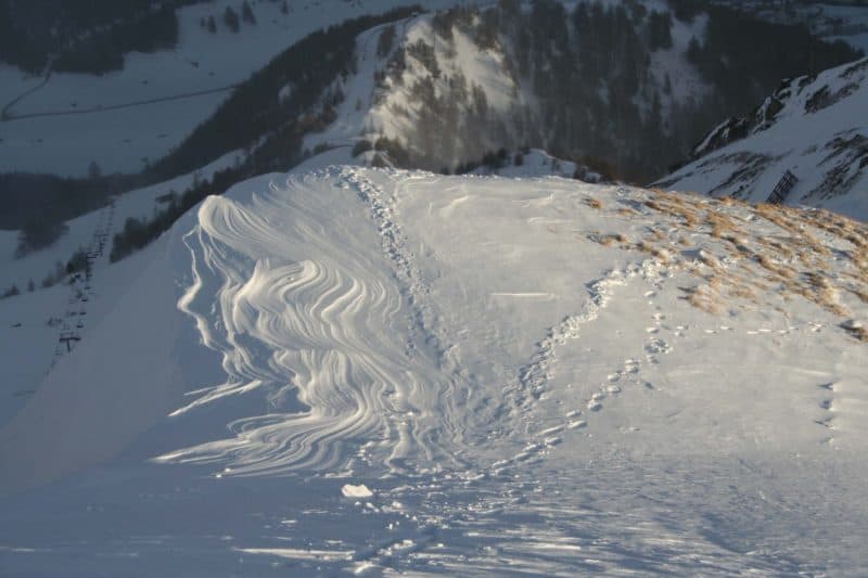– Neve ventata: ci sono diverse configurazioni della neve ventata determinate dalla velocità del vento con la conseguenza di accumuli diversi. Il vento lascia quindi sul versante sopravento un’impronta che ci permette di capire la direzione verso cui ha soffiato e di conseguenza individuare gli accumuli.